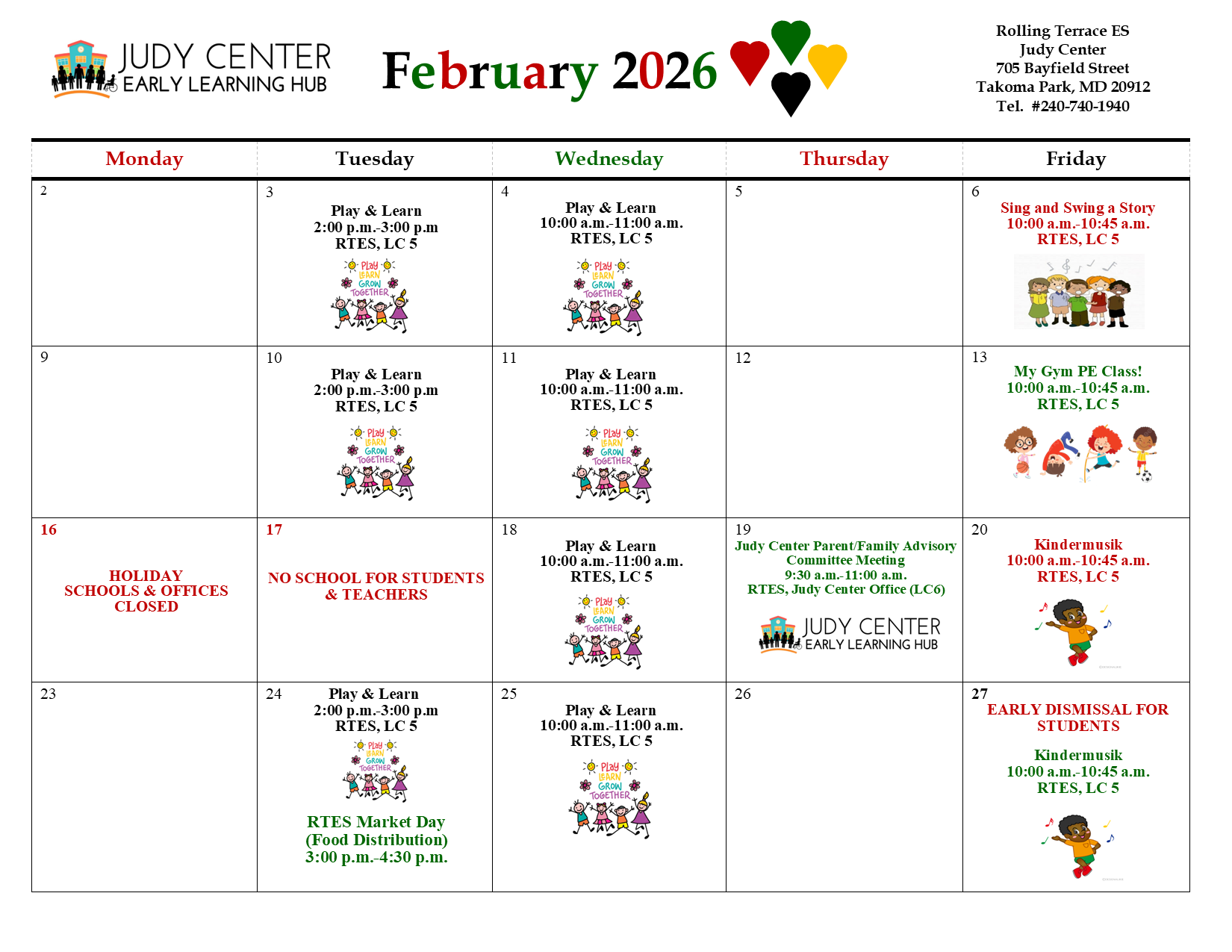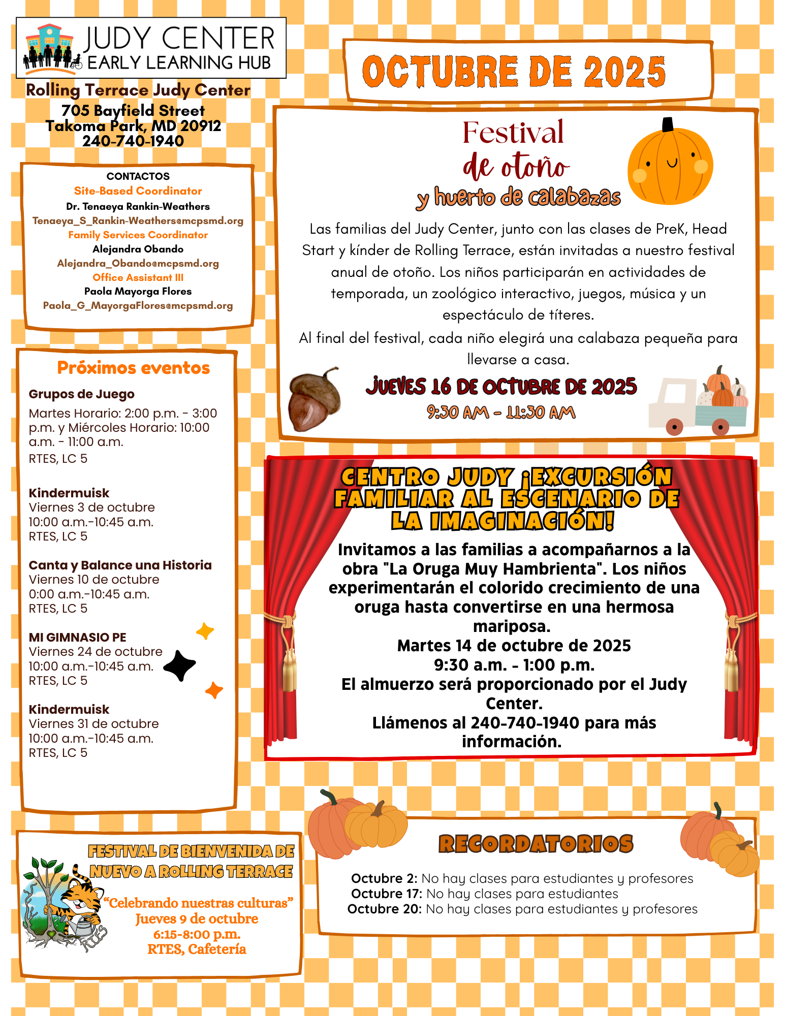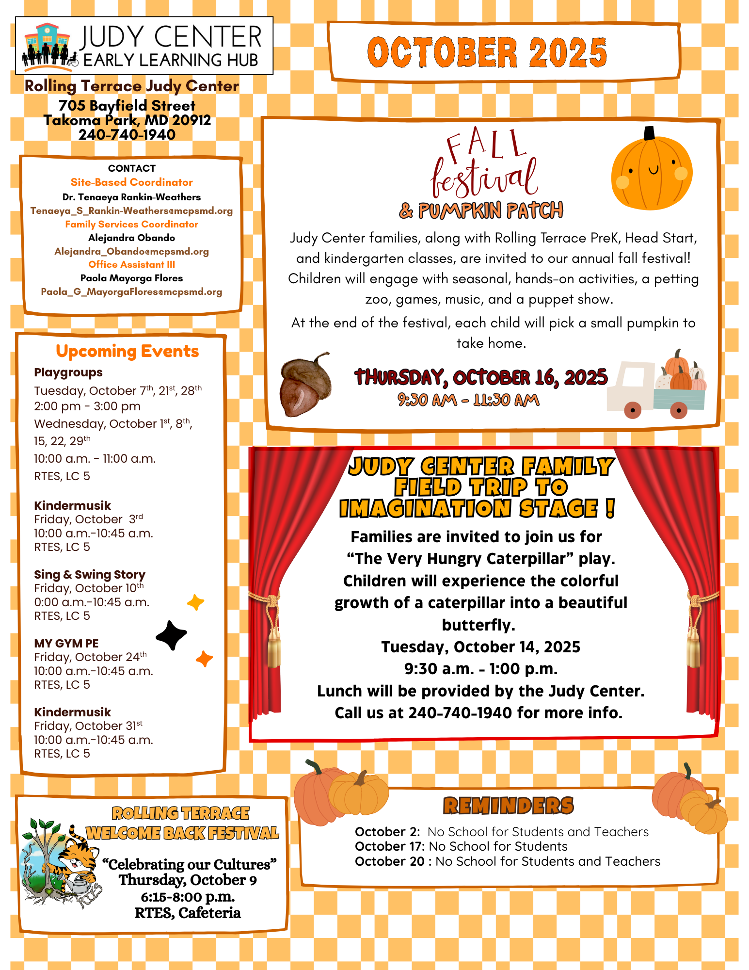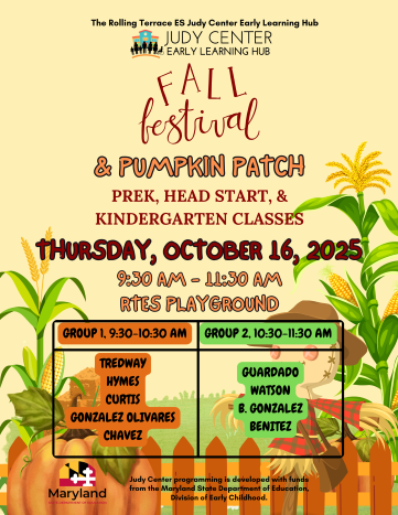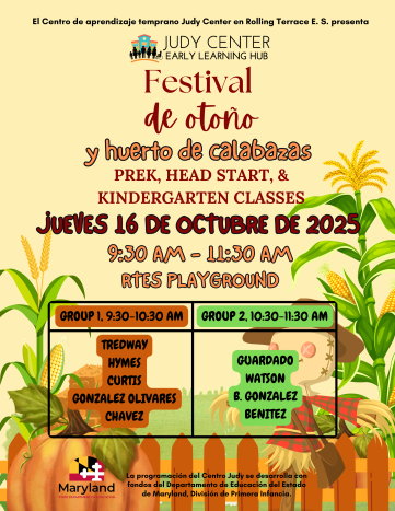 The Rolling Terrace Elementary School Judy Center Early Learning Hub serves young children and their families living in the RTES attendance area. As a part of Montgomery County Public Schools, we enlist the aid of our many collaborative partners to support school readiness for the whole family. For information about our programs, click here.