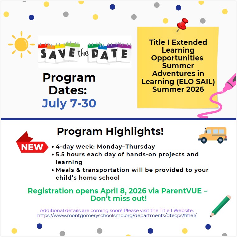 Extended Learning Opportunities Summer Adventures in Learning (ELO SAIL) is a 4-week summer program for rising K–5 students enrolled in Title I schools for the 2026–2027 school year. ELO SAIL will operate a four day program, running from Monday to Thursday each week. ELO SAIL will be offered at your child's Title I school of enrollment. Your school will provide more information in the coming weeks as Montgomery County Public Schools finalizes plans for the summer.