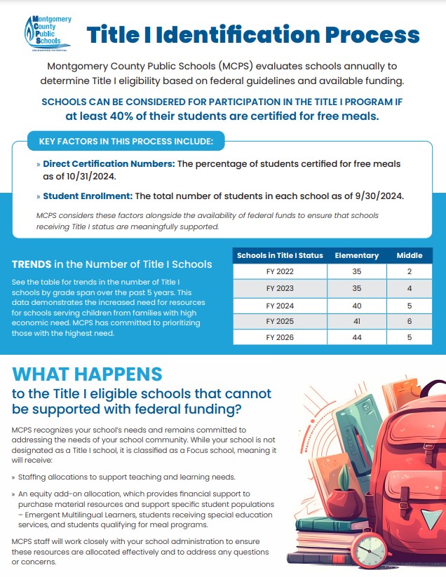Each year, Montgomery County Public Schools (MCPS) identifies Title I schools based on federal guidelines and available funding. Federal guidelines state that schools with 40% or more of their students certified for free school meals meet the criteria to be considered for participation in the Title I program.
