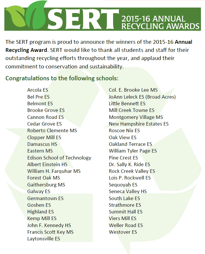 The School Energy and Recycling Team (SERT) program is a systemwide resource conservation program that promotes efficient and responsible resource use. Monetary incentives are awarded to schools based on a combination of criteria that includes demonstrated resource conservation behavior and actions, a reduction in energy use, active recycling participation, and performance data. Click here to find out how to best use your SERT award funds.