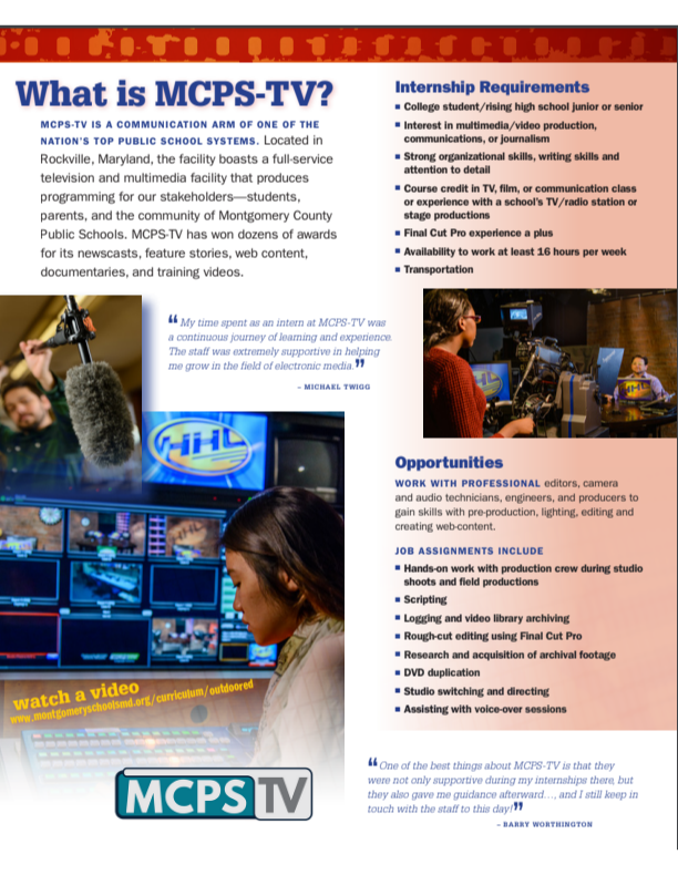 Thank you for your interest in the MCPS-TV Multimedia Internship Program. For more information, please email
