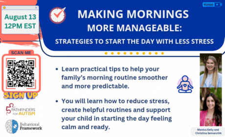In this session, Monica Kelly and Christina Semanchik will share practical tips to help your family’s morning routine smoother and more predictable. You will learn how to reduce stress, create helpful routines and support your child in starting the day feeling calm and ready. Visit registration page: https://pathfindersforautism.org/makingmorningsmanageable/