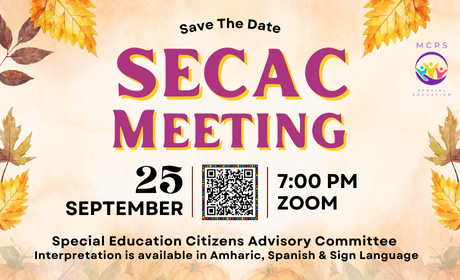 SECAC is a committee made up of parents/guardians, Montgomery County Public Schools (MCPS) staff members, and representatives of Montgomery County community groups that advocate for students with special needs and serve to advocate for, and advise, the Office of Special Education.