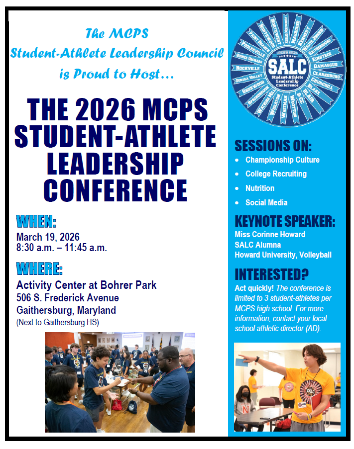 The Student-Athlete Leadership Council will host a student-led Student-Athlete Leadership Conference on March 19, 2026, from 8:30 a.m. to 11:45 a.m. at the Activity Center at Bohrer Park (506 S. Frederick Avenue, Gaithersburg, MD; adjacent to Gaithersburg High School).