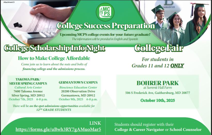 Are you looking for information on how to pay for college? Please join us for our College Success Preparation Parent Nights on October 7th at Montgomery College, Takoma Park Campus Cultural Arts Center or October 9th at the Montgomery College Germantown campus Bioscience Education Center, 5:30pm – 8:00pm.