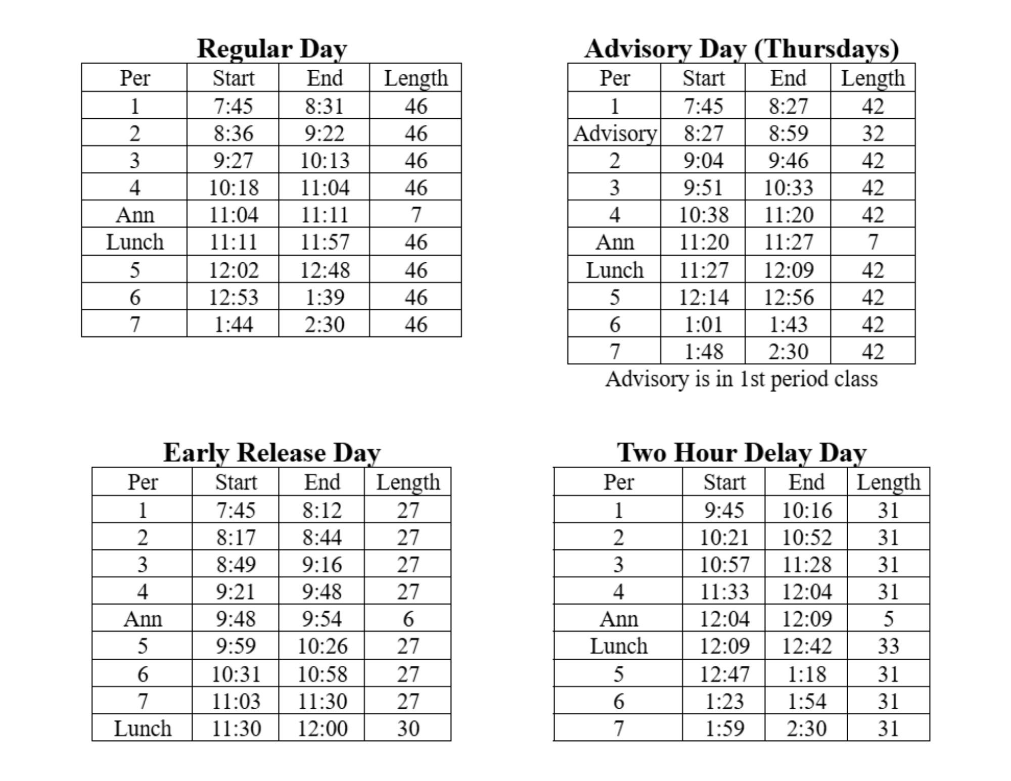 - Each Thursday we will have an advisory schedule noted as Advisory Day. During our Advisory period students will remain with their first-period teacher and will work on school-wide activities focused on topics such as social-emotional learning, restorative justice, organization, goal setting, and more.