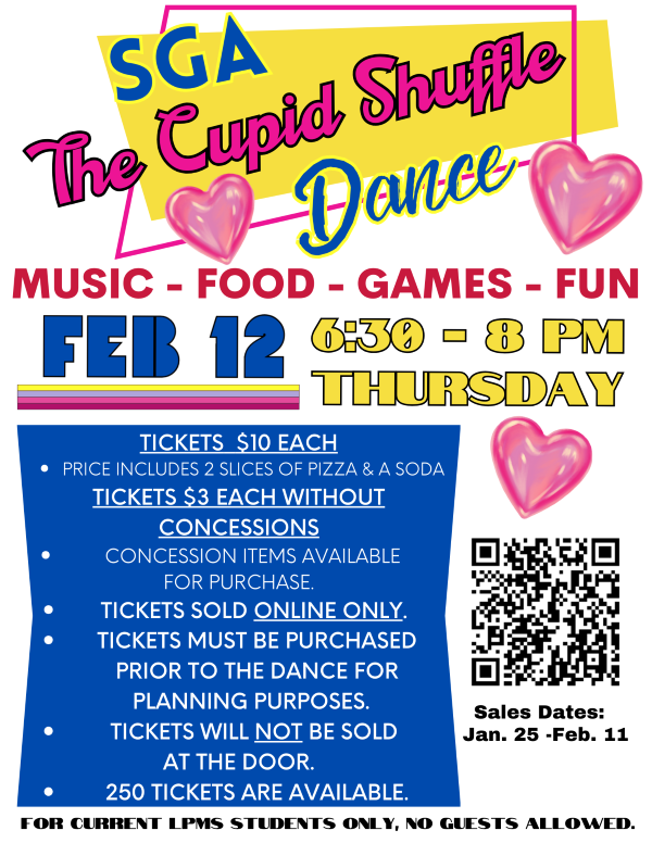 The SGA Cupid Shuffle Dance is on Thursday, February 12th, from 6:30 to 8:00 pm in the school cafeteria. Admission is limited to 250 LPMS students.