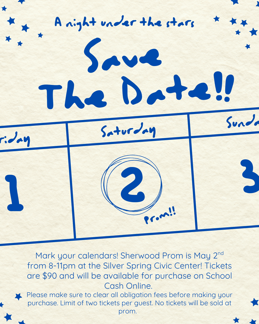 Prom tickets are $90 and are available for purchase on School Cash Online until April 22, 2026. No ticket sales will be made after this date. There will be no in-house ticket sales. There is a limit of 2 tickets per senior. If purchasing a guest ticket, please be sure to complete and submit the Google Guest Form (link shown below). This year's Prom will be held on May 2, 2026, from 8:00-11:00 p.m. at the Silver Spring Civic Building at Veterans Plaza. Students will not be able to enter after 9:00 p.m. Be sure to clear all financial obligations prior to purchasing your ticket as tickets will not be distributed to students with obligations. Students may pick up their ticket(s) during lunch on 4/28/26 - 4/30/26 in the K Hall lobby outside of the cafeteria. There is a no refund policy for ticket purchases. See Miss Smith in K168 with questions.