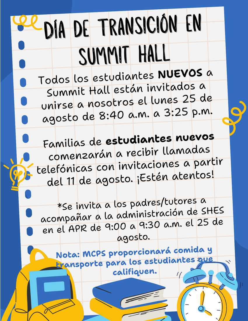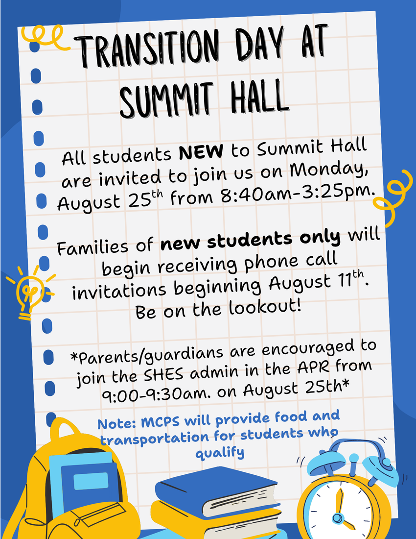 If your child is not entering kindergarten and is not new to Summit Hall ES, they will not attend school on Monday, August 25. Their first day of school will be Tuesday, August 26, 2025.